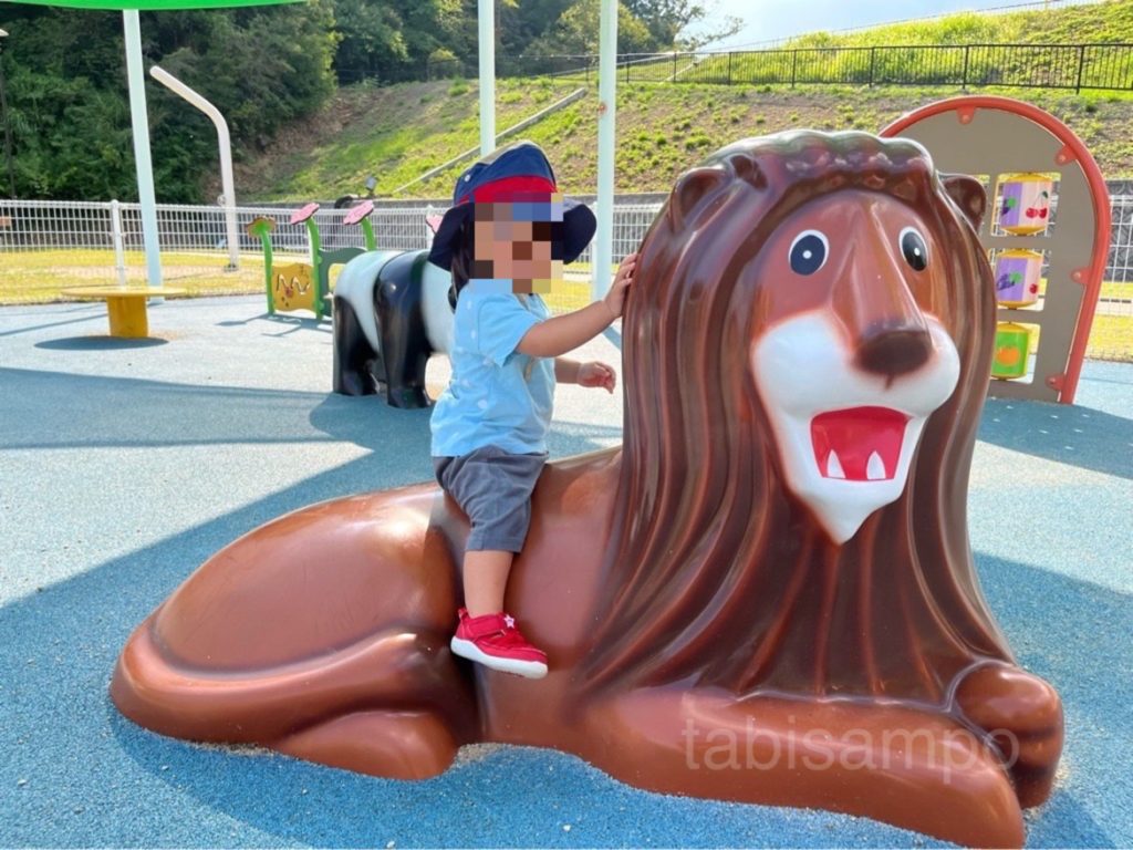 ライオンさん、パンダさん、ラクダさん、大好きな動物がいて嬉しそう。うろうろ歩いて、順番に様子を見に行っていました。まだ自分では乗れませんが、背中に乗せてみました。